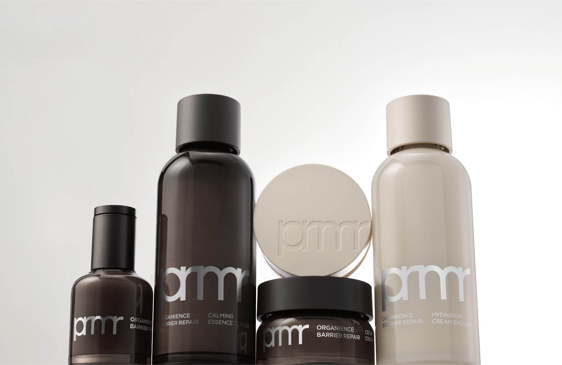 The Organience Barrier Repair line exclusively uses glass containers to reduce plastic usage. By removing unnecessary decorative elements, we emphasized the bottle’s bold and clear form while creating a sustainable design. The color palette—a combination of metallic silver, deep brown, and a healthy beige—expresses the harmony between the deep technology of seeds and the look of healthy skin. The metallic silver represents Primera’s advanced technology, the deep brown signifies the barrier-repairing properties of seeds, and the beige tone evokes a healthy complexion. Together, this combination highlights the core strength of the Organience (Organic + Science) line: functional, yet comfortable. The secondary packaging uses an uncoated paper stock to convey a natural and comforting ‘repair’ concept. The boldly sized ‘prmr’ wordmark, finished in glossy silver foil, reflects the brand’s clear and confident attitude.